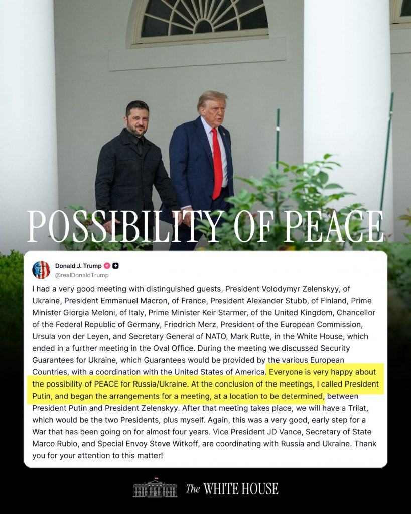 Am avut o întâlnire foarte plăcută cu distinșii oaspeți, președintele Volodimir Zelenski, al Ucrainei, președintele Emmanuel Macron, al Franței, președintele Alexander Stubb, al Finlandei, prim-ministrul Giorgia Meloni, al Italiei, prim-ministrul Keir Starmer, al Regatului Unit, cancelarul Republicii Federale Germania, Friedrich Merz, președintele Comisiei Europene, Ursula von der Leyen, și secretarul general al NATO, Mark Rutte, la Casa Albă, care s-a încheiat cu o nouă întâlnire în Biroul Oval.